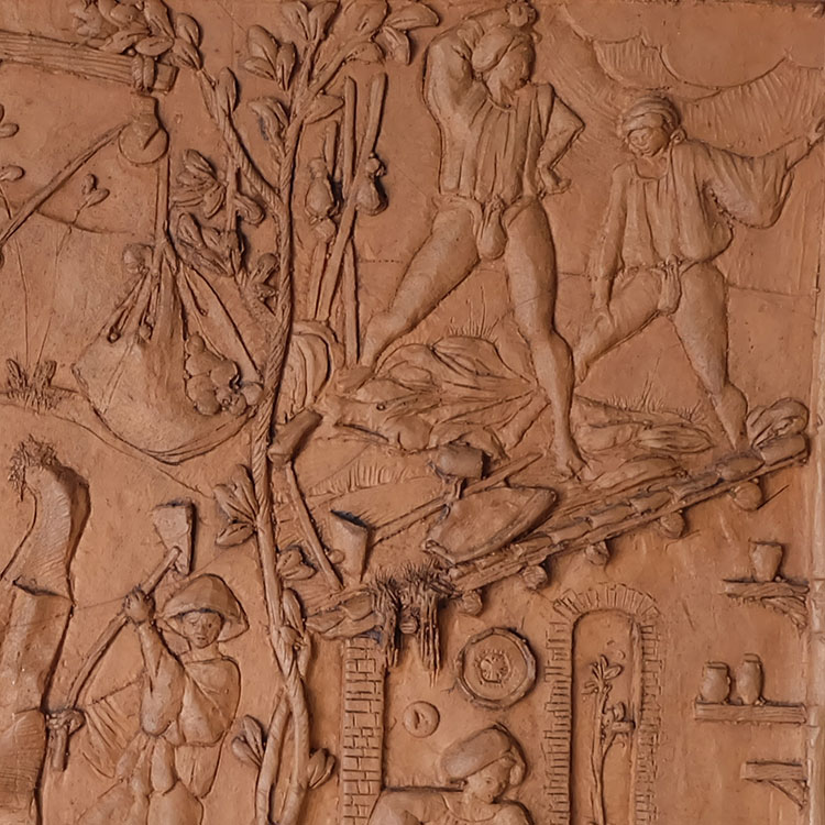 Ceramica Amiga. Grote handgevormde reliëftegel met klassieke voorstelling.