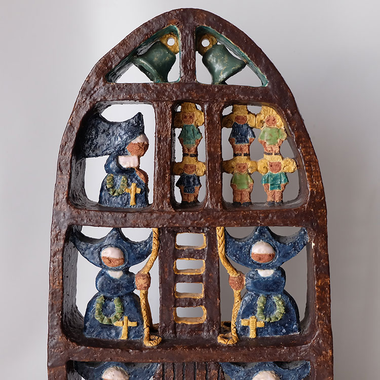 Nonnen en kinderen afgebeeld in iets wat mogelijk een kerkje moet voorstellen.
