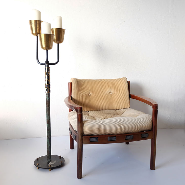 There are some scratches on the armrest and some stains in the fabric of the upholstery.